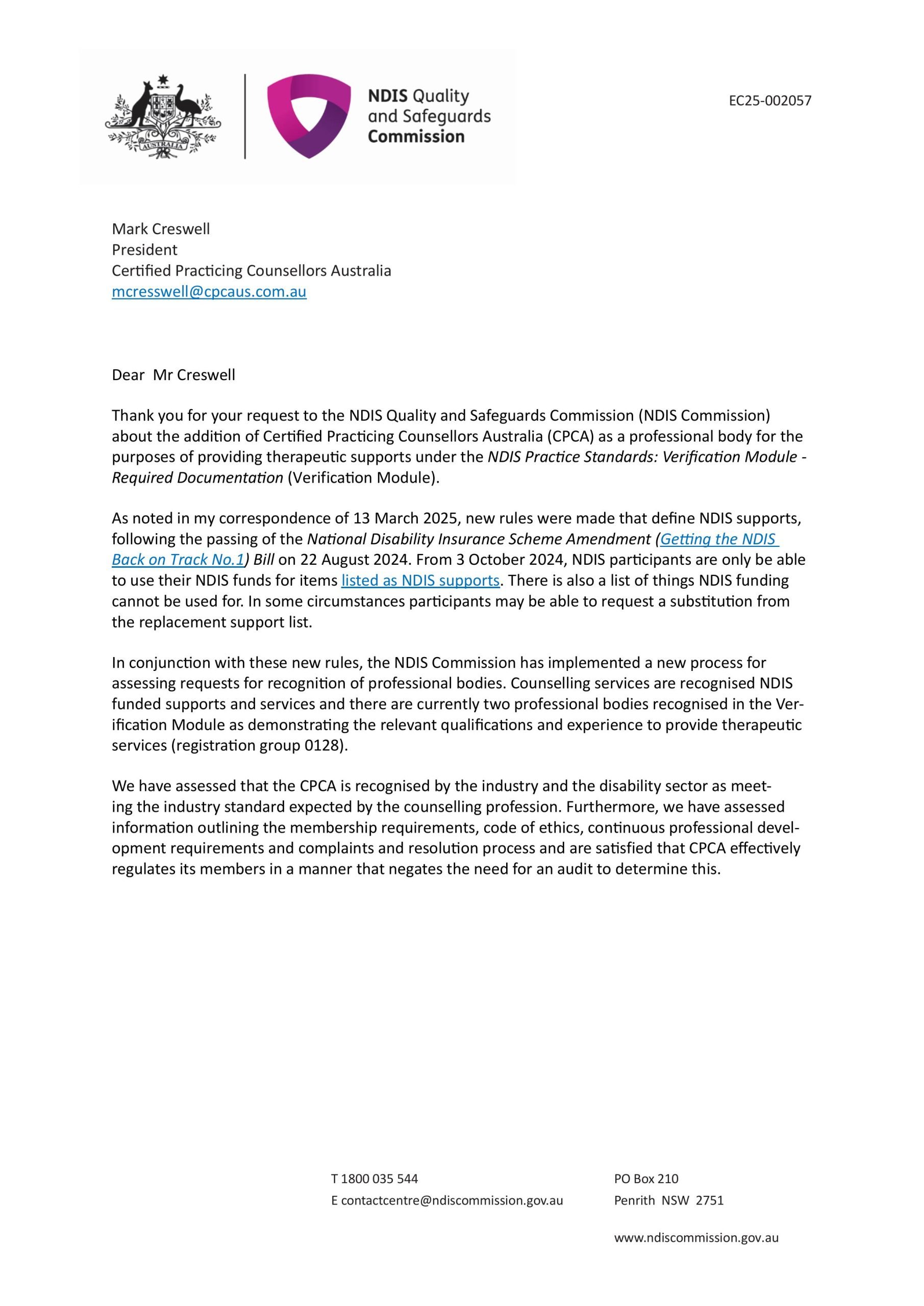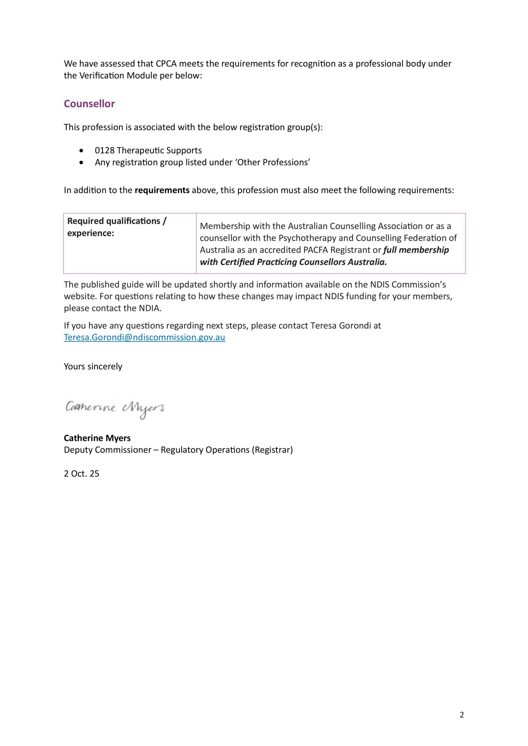 The NDIS Quality & Safeguards Commission have assessed that CPCA meets the requirements for recognition as a professional body under the Verification Module per below: